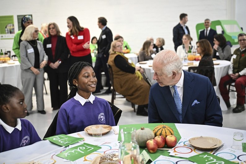 Король Великої Британії Карл III розмовляє з учнями початкової школи Рай-Оук, які отримують допомогу від проєкту “Коронаційна їжа, південно-східний Лондон, 14 листопада 2024 рік. AP/Джастін Талліс