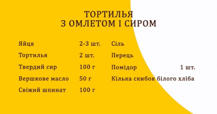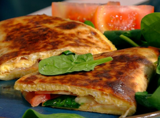 Збити яйця, додати сіль і перець за смаком. Влити суміш на пательню і підсмажити омлет з одного боку. Викласти зверху тортилью, перевернути вниз коржем. Додати всередину тортильї з омлетом натертий сир, слайси помідора і шпинат. Скласти тортилью навпіл. Зверху змастити маслом. Смачного!